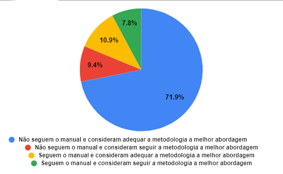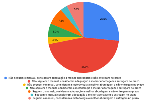 Ao consolidar a análise de todas as questões, observamos que mais de 45% dos profissionais não seguem estritamente o manual, optando por considerar a adaptação da teoria como uma abordagem mais promissora, e conseguem cumprir os prazos. Adicionalmente, cerca de 27% dos profissionais compartilham dessa visão, embora enfrentem dificuldades para cumprir os prazos.